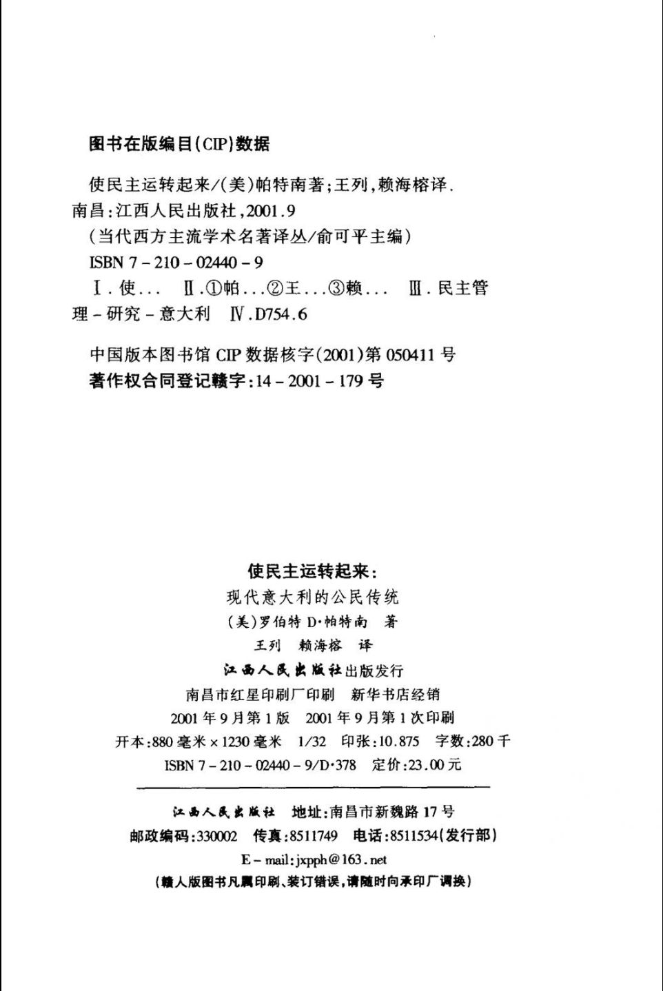 006当代西方主流学术名著译丛 使民主运转起来:现代意大利的公民传统 (英)罗伯特·D.帕特南(Robert D.Putnam)著;王列,赖海榕译. 江西人民出版社, 2001.pdf 130.36 MB