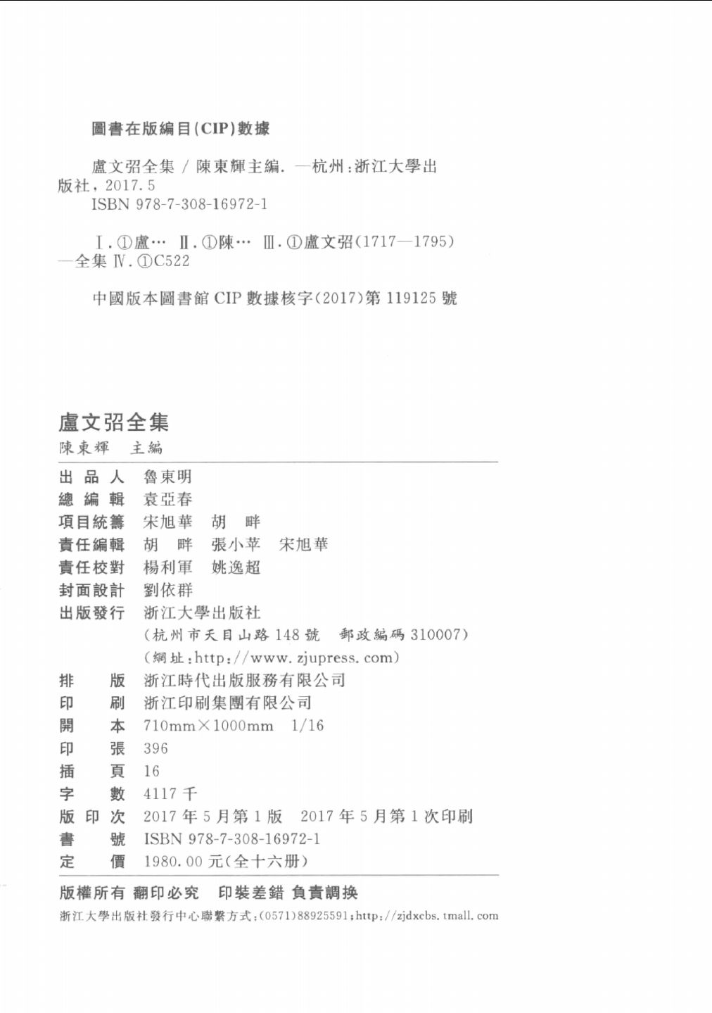 卢文弨(1717-1796)乃清代乾嘉时期的著名学者,学识博洽,著述宏富。浙江大学汉语史研究中心陈东辉主编的《卢文弨全集》,是作为“浙江文化研究工程”重要组成部分的《浙江文献集成》之一种,列入“2011-2020年国家古籍整理出版规划”,并成功入选“2015年度国家古籍整理出版专项经费资助项目”。《卢文弨全集》主编的主要研究方向之一是清代学术史(尤其是阮元、卢文弨研究),已在这一领域出版《阮元与小学》《清代学术与文化新论》等多种专著,主编《清代学者研究论著目录》初编和续编等多种工具书以及《抱经堂丛书(外七种)》《文澜阁四库全书提要汇编》《杭州诂经精舍课艺合集》等大型古籍影印丛书,发表相关论文近百篇,曾在与清代学术研究相关的多篇综述类文章中被列为核心作者。《卢文弨全集》包括《群书拾补初编》《群书拾补补遗》《仪礼注疏详校》《经典释文考证》《广雅(释天以下)注》《重校方言》《钟山札记》《龙城札记》《读史札记》《抱经堂文集》《抱经堂诗钞》《常郡八邑艺文志》等,其中大部分是首次整理校点。尤其是《广雅(释天以下)注》目前所知仅有国家图书馆藏清抄本(存二卷,九至十中),以前鲜有人论及,此次将该清抄本(包括其天头的钱大昕、钱大昭、丁杰等与卢文弨交游甚密的同时代学者之案语)加以整理校点。另有校点者通过多方努力,搜集整理而成的近十万字的《抱经堂集外佚诗文》。同时,校点者还将与卢文弨有关的墓志、传记、书信、诗歌、序跋、提要等,以及陈修亮编著的《卢文弨钞校题跋本目录》,彭喜双、陈东辉编著的《卢文弨研究文献目录》,柳诒征编著的《卢抱经先生年谱》,张波、赵玉敏新近编著的三十多万字的《清卢抱经文弨先生年谱》,作为《卢文弨全集》之附录,希望能给相关研究者带来“一编在手,如指诸掌”之便利。此外,主编还撰写了长达五万多字的学术性极强的前言,并从全国各地图书馆选取了32幅较为珍贵的相关书影,作为《卢文弨全集》卷首之彩色插图。全书装帧考究,字大行疏,版面清朗。