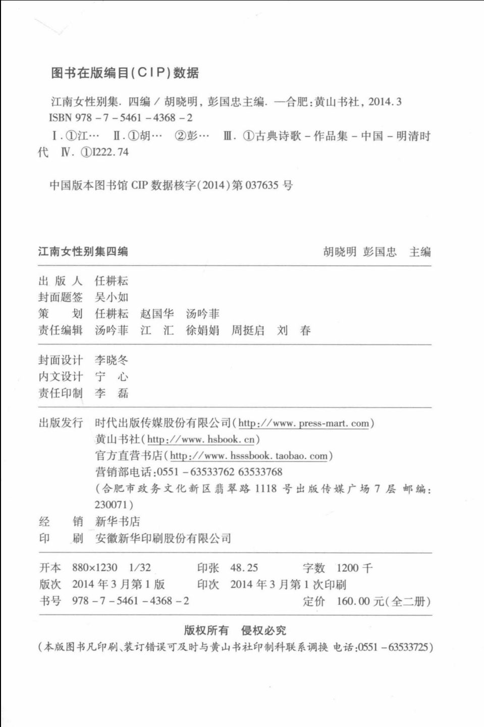 《江南女性别集(初编)(套装上下册)》主要内容:夫孝穆纪咏,荟丽什于玉台,仲伟着评,冠清裁于团扇。历数前秀,代标女宗,矧乃家依山水之窟,案齐诗酒之瓢。吐言成玑,和响若磬,允足陶冶风雅,拔擢性灵。《华影吹笙阁遗稿》一卷,沈西靡先生贤俪戴夫人所著也。名驰绮龄,早悦笔砚,根有慧果,善吟桂荃。逮反马礼成,弋凫歌作,同功织茧,并坐调簧。南峰北峰,延眺佐之清籁;春月秋月,平章呼为诗朋。互留雅谭,都垂丽制。无如令辰不居,罡风易贯,未薄虞渊之景,忽衔茎邱之悲。先生神凄荀粲,愿违高柔,柱绝瑟僵,怕听同心之曲,帘荒璧冷,犹呼已烬之灯。石感三生,霜更廿稔,将校刊乎曩编,藉纾痛于长簟。逐及下走,系以弁词,亟盥薇芬,载纳芸册。或春云等润,或冬雪争皎。花木五色,旌以珠衔,湖山有灵,收入镜槛。乐昌绮练,争吟蜡烛之篇,令晖宏通,蔚成香茗之集。虽明诚之录金石,词女亦勒新书,苏蕙之织锦机,传作尚多佚本。而斑窥具是墨妙,粲然快睹,翩鸿舞鹤,缀言聊埘于肿扬。庶几翰鸟游鱼,怀旧少开其轸结。