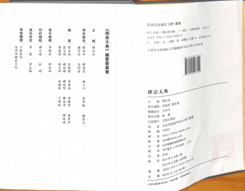 《禅宗大典》,由少林寺方丈释永信主编,历时六年完成。全书共200册,分为经典部、六祖部、灯史部、传记部、宗义部、语录部、清规部、文学部、寺志部、杂集部等十大部类。内容收辑禅宗相关文献多达一千七百四十八部(篇),文献主要来源于历史上各时期刊刻的《大藏经》、历史上各地刊行的方志、山志、寺院志、敦煌文献、大型类书、历代散刻、散印的重要禅宗文献、民国期刊、日本、朝鲜及越南等国的禅宗文献等。上起后秦下至民国,是迄今为止收录禅宗典籍最全的一部丛书。