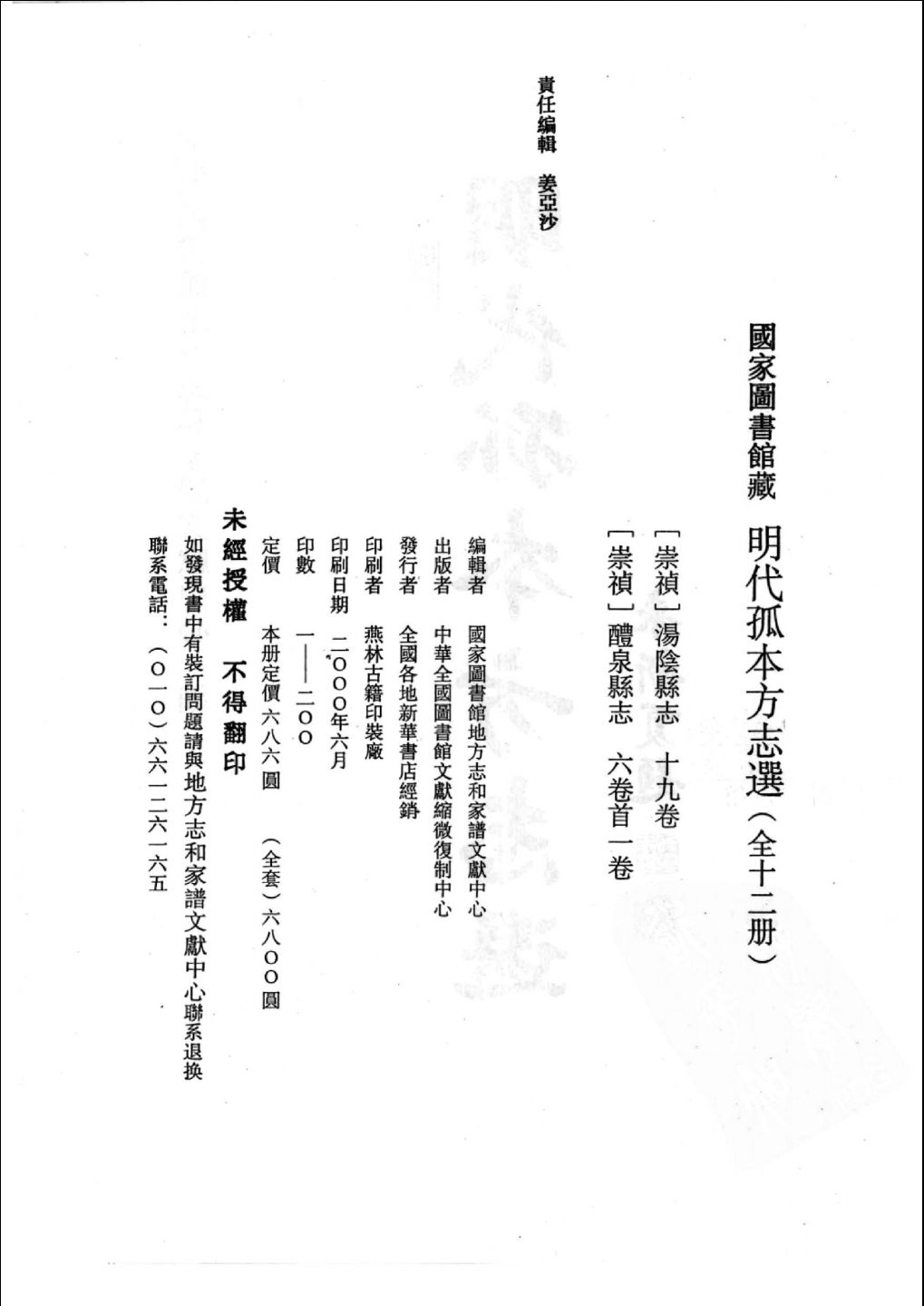 此部《明代孤本方志选》,是从全部馆藏文献中仔细查阅、核对,精心筛选出来的,所选志书符合如下两个条件:1.《中国地方志联合目录》