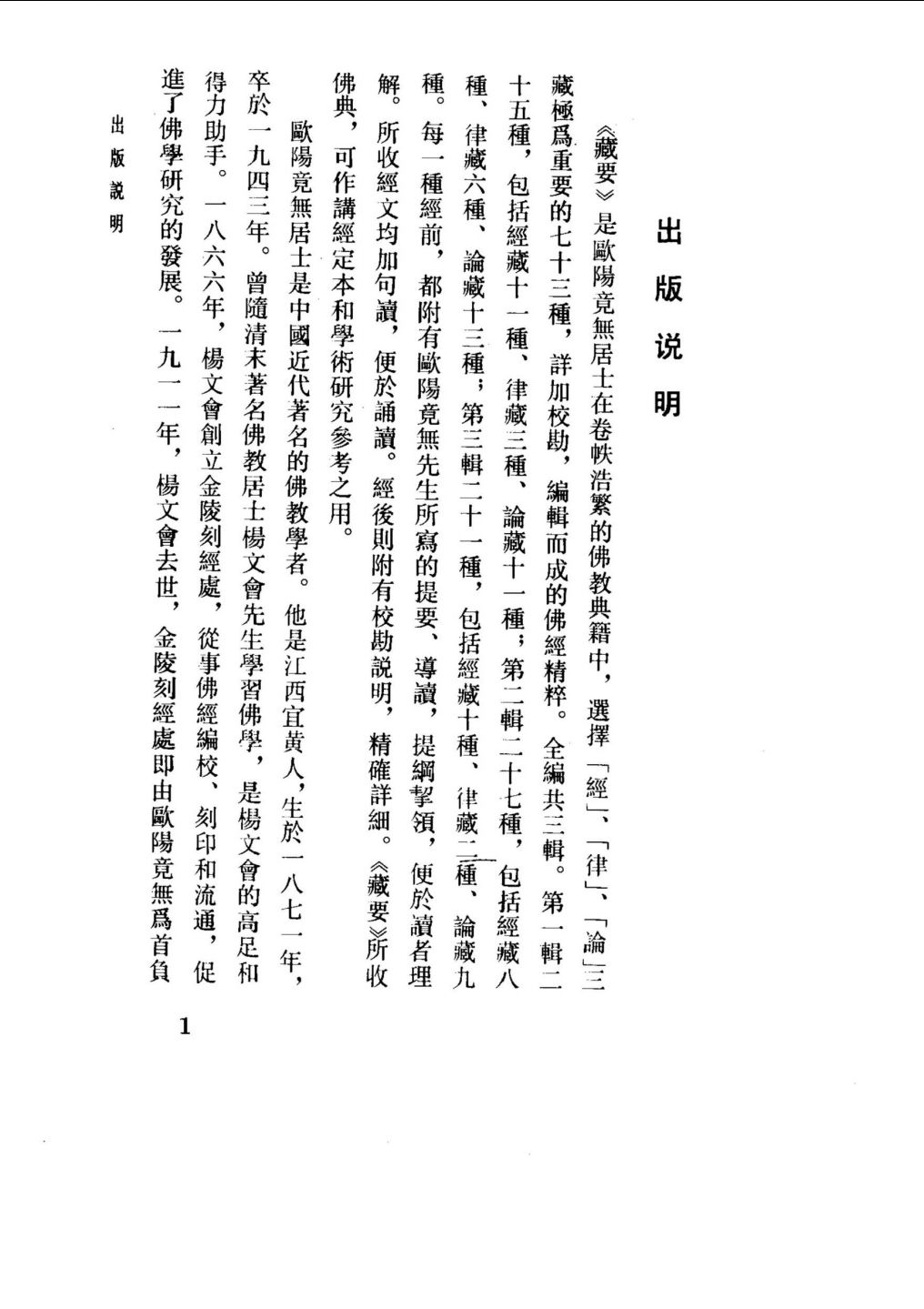 《藏要》是欧阳竟无居士在卷帙浩繁的佛教典籍中,选择[经]、[律]、[论]三藏极为重要的七十三种,详加校勘,编辑而成的佛经精粹。全编共三辑。第一辑二十五种,包括经藏十一种、律藏三种、论藏十一种;第二辑二十种,包括经藏八种、律藏六种,论藏十三种;包括经藏十种、律藏二种、论藏九种。每一种经前,都附有欧阳竟无先生所写的提要、道读,提纲挈领,便于读者理解。所收经文均加句读,便于育读。经后则附有校勘说明,精确详细。《藏要》所收佛典,可作讲经定本和学术研究参考之用。