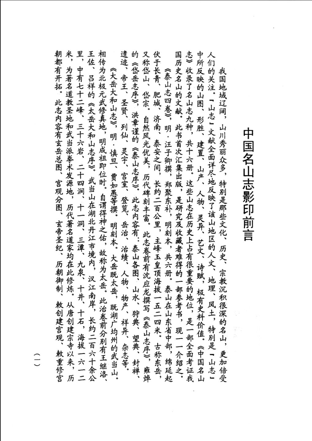 《中国名山志》收录了《华山志》、《泰山志》、《九华山志》、《武夷山志》、《普陀山志》、《五台山志》、《黄山志》等十余种。这些山志在历史上占有很重要的地位,特别是山志中所反映的山图、形胜、建置、山产、人物、灵异、艺文、诗赋。该书是一部全面考证我国历史名山极有史料价值的文献,首次汇集出版,是研究及收藏者难得的一部参考书。全国图书馆文献缩微复制中心影印出版。