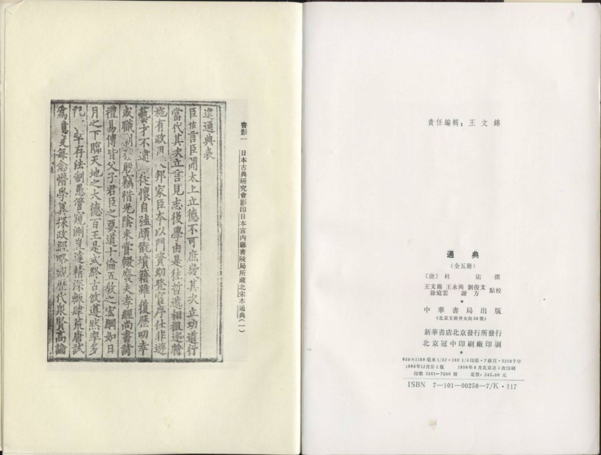 (唐)杜佑 撰 王文锦、王永兴、刘俊文、徐庭云、谢方 点校:《(校点本)通典》(精装25开全五册)(北京:中华书局,1988年12月,第1版1996年8月北京第3次印刷)