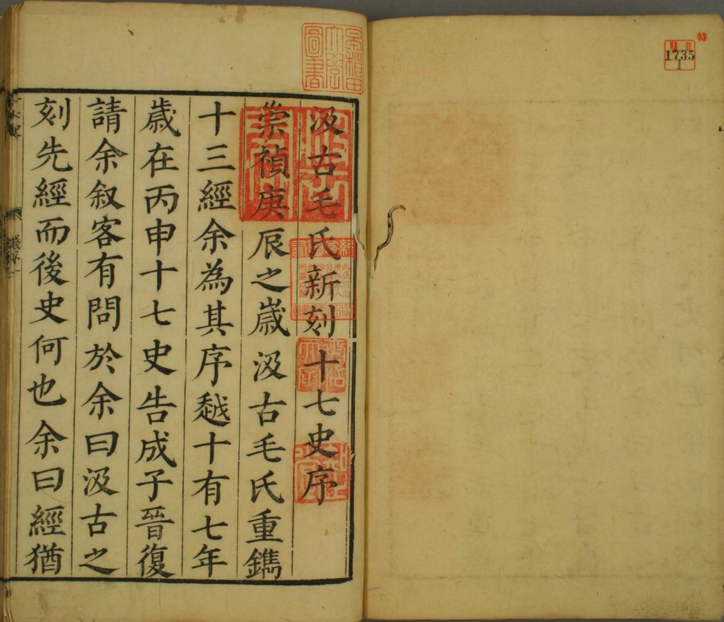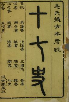 提要:十七史之名,盖源出《宋史.艺文志》。以《旧唐书.经籍志》乙部正史类著录自《史记》以下至《隋书》止,凡十三史,宋人加《南史》、《北史》、《新唐书》、《新五代史》四种,合之遂有“十七史”之称。清代学者王鸣盛《十七史商榷》言“宋时尝汇而刻之者也”,迄未见实物及他说,恐为虚言。今合刊十七史,仅明末毛子晋编辑校刻一种而巳。《中国古籍善本总目》P205著录。