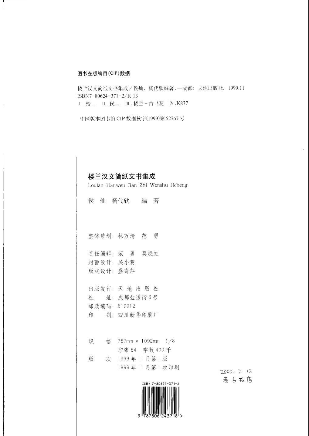 【参考文献格式】侯灿, 杨代欣编著. 楼兰汉文简纸文书集成. 天地出版社, 1999.