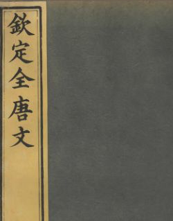 《钦定全唐文》,1000卷,卷首四卷,清董诰、阮元、徐松等奉诏编纂,清嘉庆二十三年(1818年)扬州局刻本。半页9行,行22字,白口,四周双栏,版框19.9cm×14.5cm,共1004册。卷首有嘉庆十九年御制序、二十三年御制读《全唐文诗》一首,董诰等进书表及纂修诸臣职名。