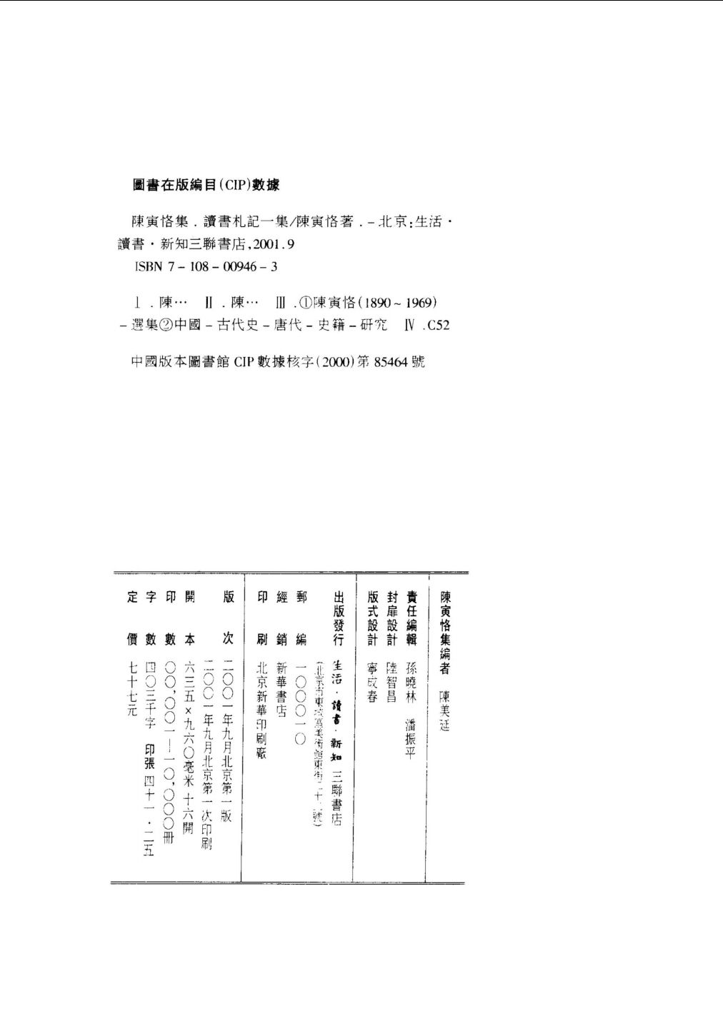生活·读书·新知三联书店编辑的《陈寅恪集》是社会各界的广大读者一直关心的一套图书。2001年年初,《柳如是别传》首先出版,此后,《元白诗笺证稿》、《寒柳堂集》、《诗集》、《书信集》、《金明馆丛稿初编》、《金明馆丛稿二编》、《隋唐制度渊源略论稿》、《唐代政治史述论稿》,以及《读书札记》一、二、三集陆续推出。今年6月,《陈寅恪集》的最后一册《讲义及杂稿》终于面世。这样,三联书店版《陈寅恪集》十三种十四册全部出齐。