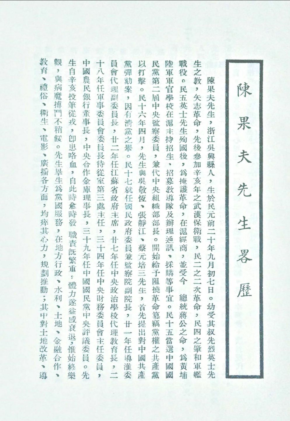 陈果夫(1892-1951),名祖焘,字果夫。浙江吴兴东林镇人。民国时期政治人物,是国民党内右派。1926年,陈果夫当选为国民党第二届中央监察委员,任中央组织部代部长 。