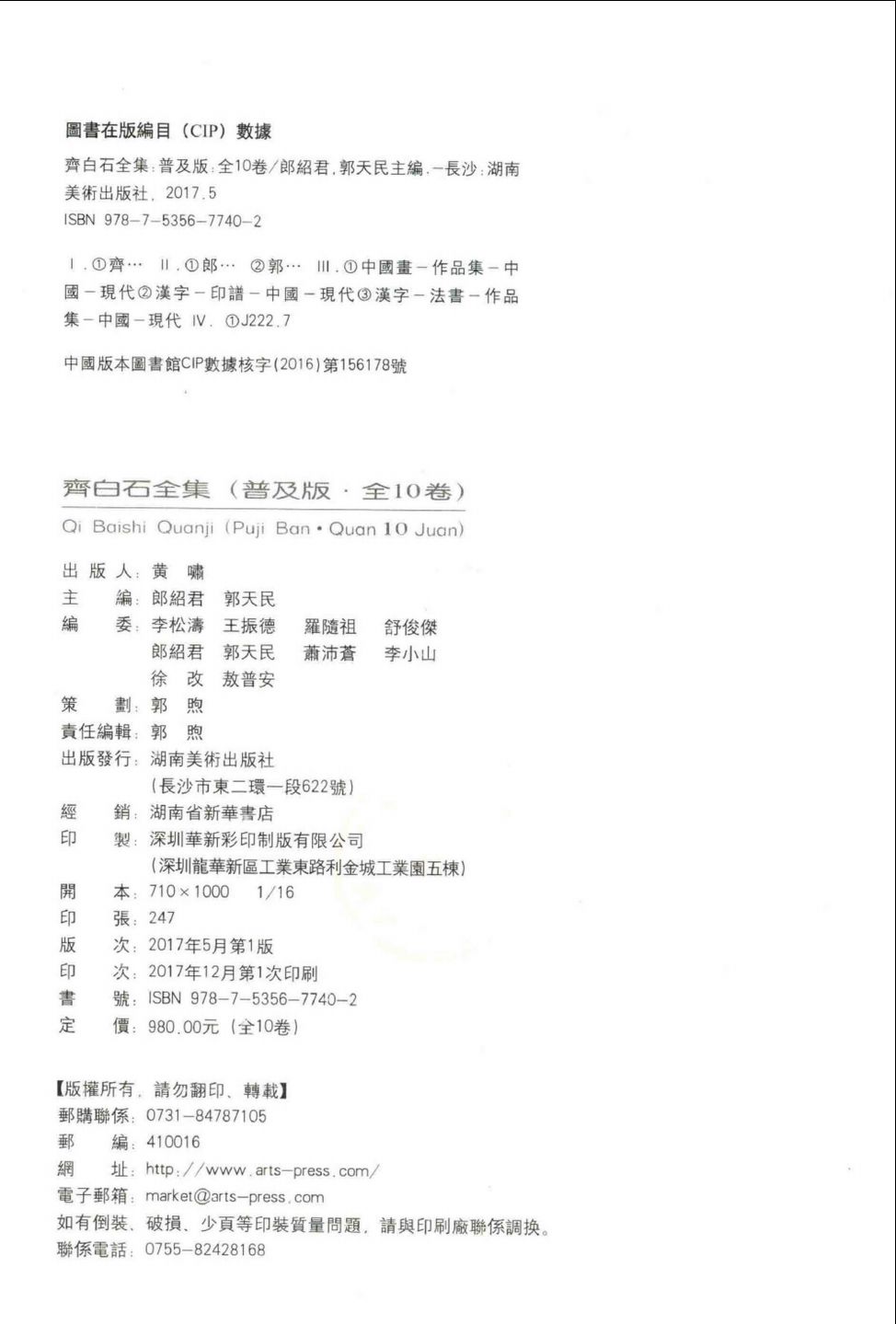 齐白石全集于1997年由湖南美术出版社正式出版,该书一经出版,便引起海内外学术界的广泛好评,也因此获得第三届“国家图书奖”的正式奖。今年是出版《齐白石全集》20周年,又恰逢齐白石逝世60周年,更是恰逢齐白石巨制《山水十二屏》以9.315亿元成交创中国巨贵艺术品世界纪录,作为湖南人,我们感到骄傲,我们决定把原本定价9800元的8开本《齐白石全集》100%的内容改变为小16开本定价980元的《齐白石全集》(普及版)以飨读者,方便更多读者随身阅读,亲近大师。小全集由9篇学术文章、294幅附图、54件木雕、2121件绘画、315件书法、2100件印谱、1887首诗文组成,按10卷成套,让你轻松携手20世纪伟大的艺术家。