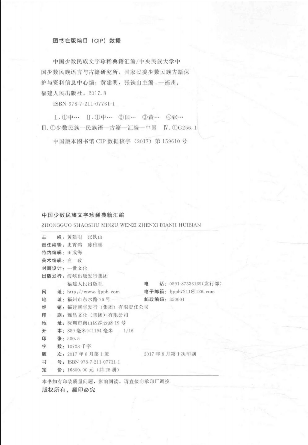 本套丛书于2017年8月由福建人民出版社出版,曾被列入国家“十二五”少数民族语言文字出版规划和2016年度国家出版基金资助项目。该书由我国著名民族语言学家、民族古文字和文献学家、中央民族大学荣誉资深教授张公瑾先生任名誉主编,中央民族大学民族语言文字与古籍研究专家黄建明、张铁山两位教授担任主编。