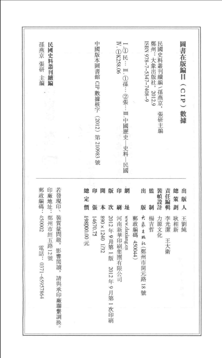 民国史料丛刊(续编)(全1140册,附总目提要)是《民国史料丛刊》的姊妹篇。她所涵盖的时段,依然是中华民国成立到1949年中华人民共和国创建的38年。民国时期出版的中文图书在10余万种以上。2009年,我们经过多年努力,四方采集,以政治、经济、社会、史地、文教分类,编辑了大型数据丛书《民国史料丛刊《民国史料丛刊(续编)》(全1140册,附总目提要)收录民国纸质文本2194种,合编1127册,总量约合563500页,另备总目提要一册。丛刊出版后,获得学界一致好评。有鉴于此,我们再接再励,推出《民国史料丛刊续编》以飨读者。承前,《民国史料丛刊(续编)》(全1140册,附总目提要)继续以政治、经济、社会、史地、文教分类,精选资料2268种,合成1139册影印出版,总量与正编大体相当。