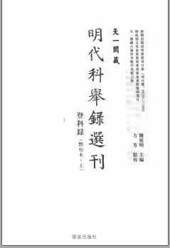 天一阁藏明代科举录选刊 登科录(点校本)是独尊海内的,辑录了明代某年、某科科举中式人数、姓名、籍贯和名次等记录,是科举制度的“实物例证”和直接的“人物传记史料”,它对明代科举制度和科举人物的研究都有十分重要的意义。