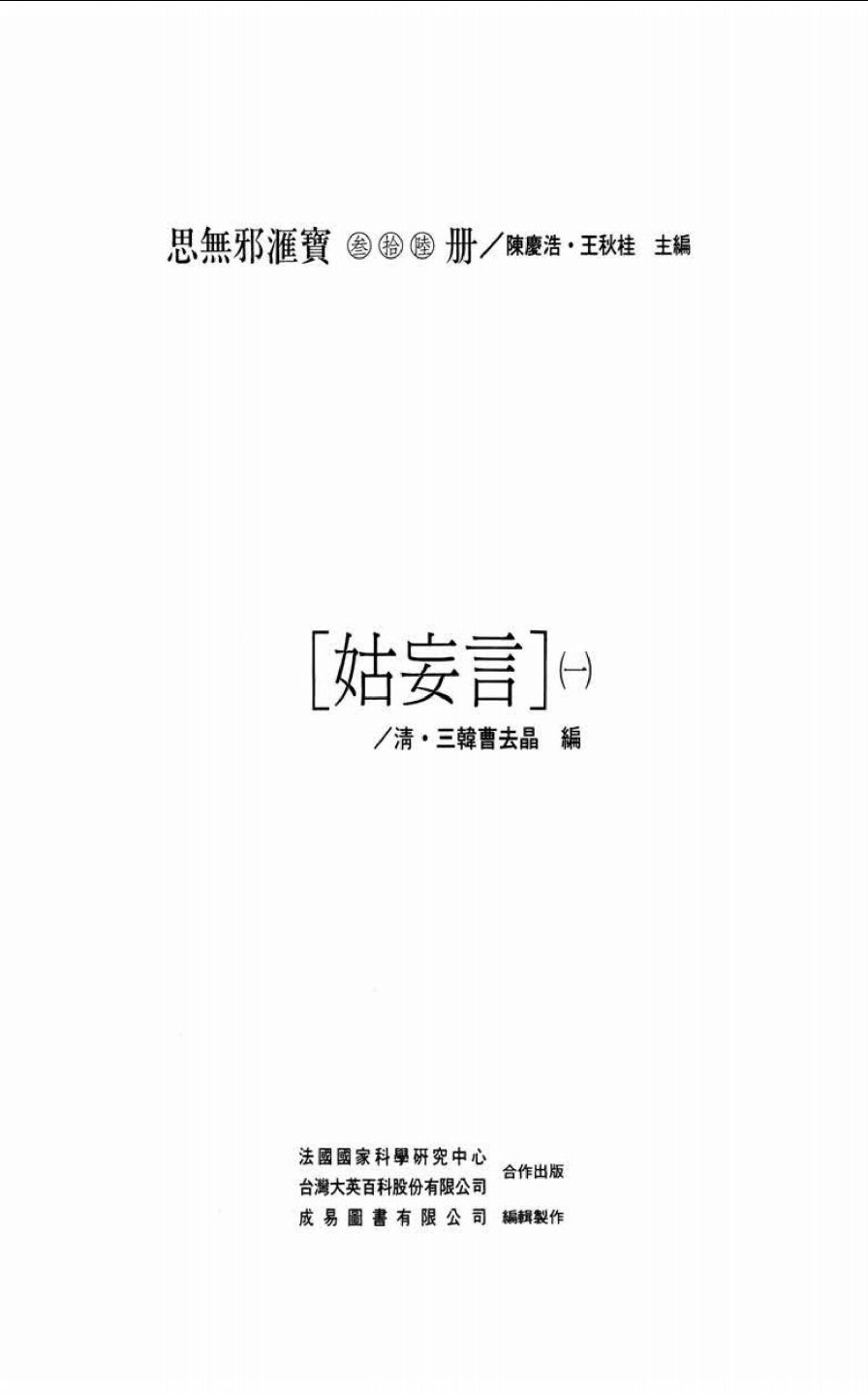 《思无邪汇宝》收录明清**四十五种,凡三十九册。另有《外编》二册,收录相关文献十一种。陈庆浩、王秋桂主编,法国国家科学研究中心、台湾大英百科股份有限公司合作出版。自1994年9月开始陆续出版,至1997年8月全部出齐。