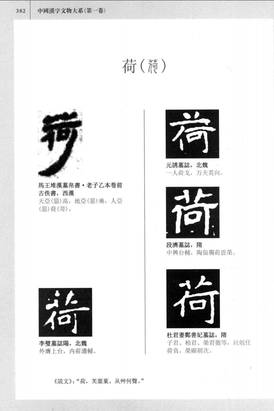 全书15卷。前14卷为正文内容,按照《说文解字》540部首的结构统领全书,系统收录了自先秦至唐代各类文物上所见汉字的原始形态,共计4344个字头,45562个字形。所选文物种类力求多样而富于代表性,涉及甲骨、金石、古陶、货币、简帛、石刻、残纸等。字形下列出其所出实物文献载体的名称、著录、时代及相关语段的释文。对于能突出体现某种文字变化发展的字形,以按语的形式在相关字形下作简要阐释。每字在字形收录完毕之后,以源流综论的形式梳理该字的形义发展过程。为使读者对汉字及其蕴含的文化有更直观的认识,每卷选收约200帧彩色器物图片插配其中,生动展示了从甲骨、青铜器到竹简、帛书再至石刻、卷纸等丰富的汉字载体。第十五卷为附录,附有音序、笔画、文物、彩图等索引及参考书目,方便读者查阅。