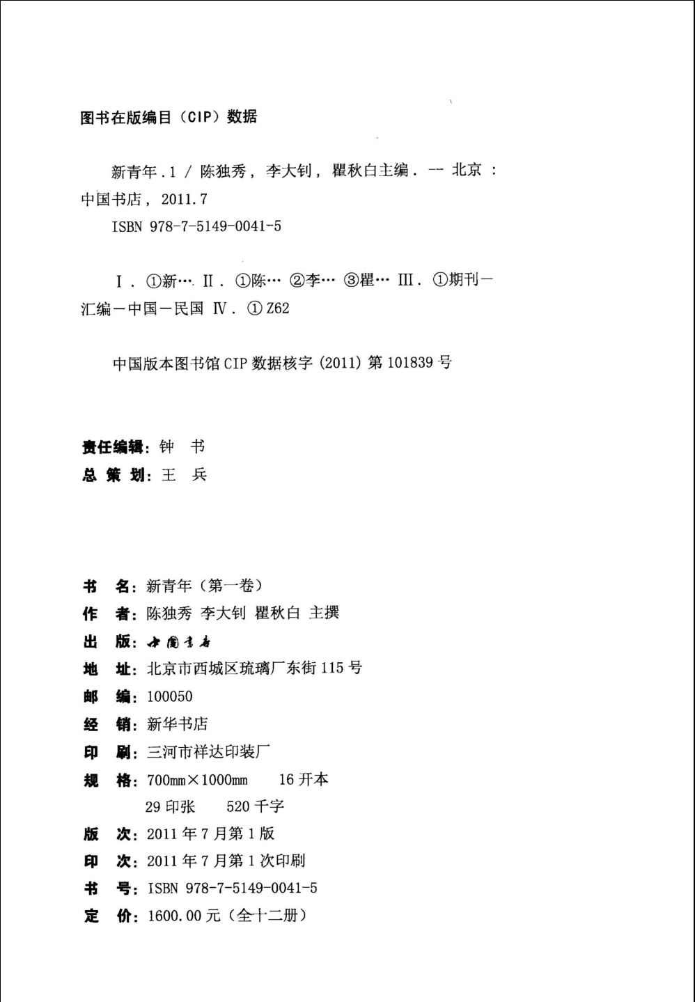 从1915年9月到1926年7月终刊时止,《新青年》计出11卷,共有63期,其中前9卷为月刊,第10卷为季刊,第11卷为不定期刊。本书即为其简体字版,为更好的还原历史,本简体横排版在其分卷、分期方式及体例上仍袭其旧,外国人名、地名及著作名、事物名等的译法也保留了当时的译法,未作改动,并在各卷中影印了近280幅《新青年》原稿,以供读者对照欣赏。