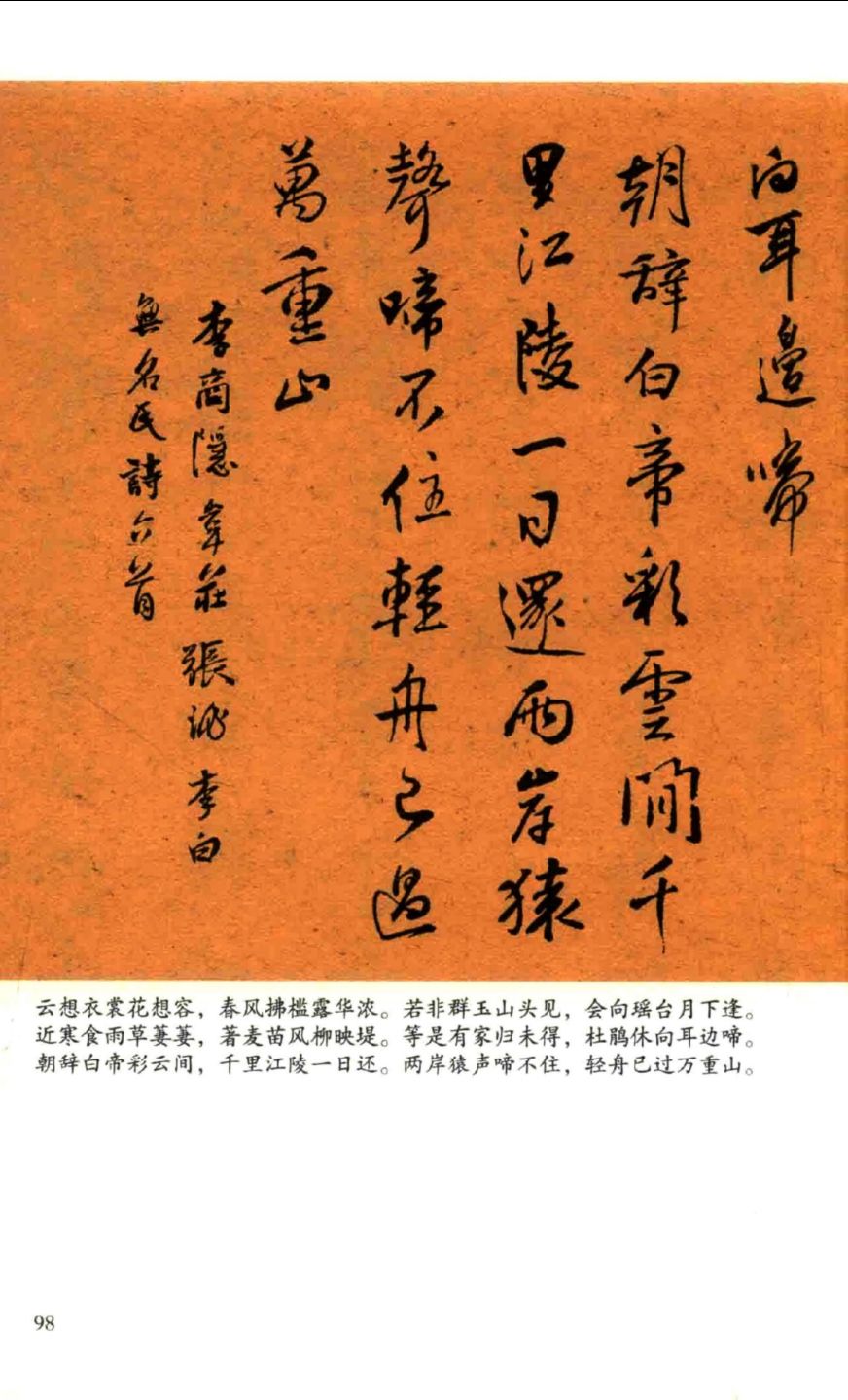 本丛书以古代经典诗词为内容,通过现代计算机技术,将历代经典碑帖草书范字集合在200余幅书法作品中。力求风格统一,行气流畅,章法形式多样,既可直接供书法爱好者临摹,又可为其书法创作提供借鉴,集书法与文学价值于一身。