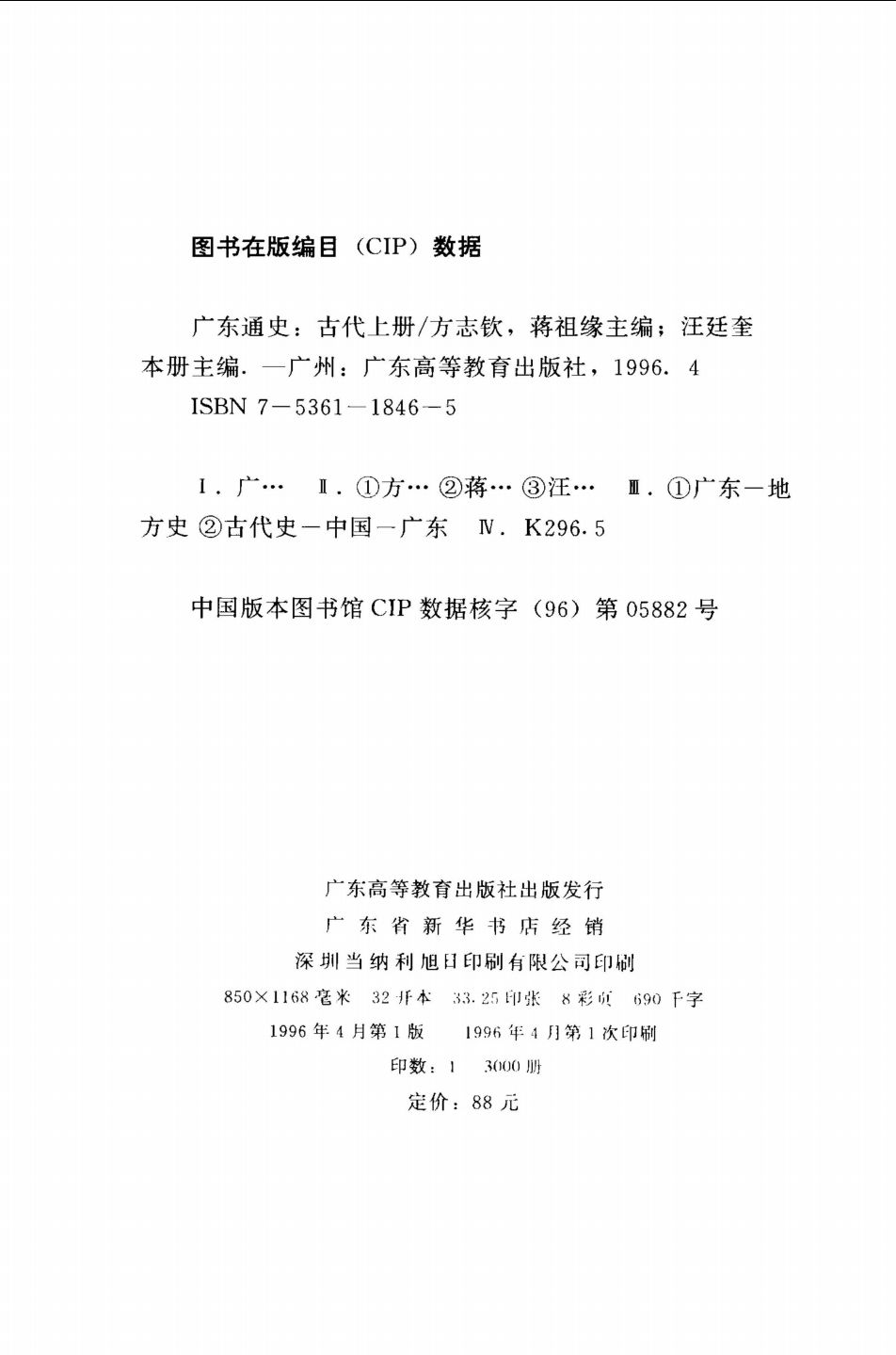《广东通史》成三部六册:古代部分上下二册,上册自史前至元代,下册自明代至清代鸦片战争以前;近代部分上下二册,上册自鸦片战争至洋务运动,下册自维新运动至护法运动;现代部分上下二册,上册自五四运动至土地革命,下册自抗日战争至解放战争。古代部自上古至鸦片战争前,只占全书的1/3,而近现代两部110年的历史却占全书的2/3,可谓“厚今薄古”了。所以如此,并非我们对广东近现代史有所偏爱,而是根据广东历史发展的特点来决定的。