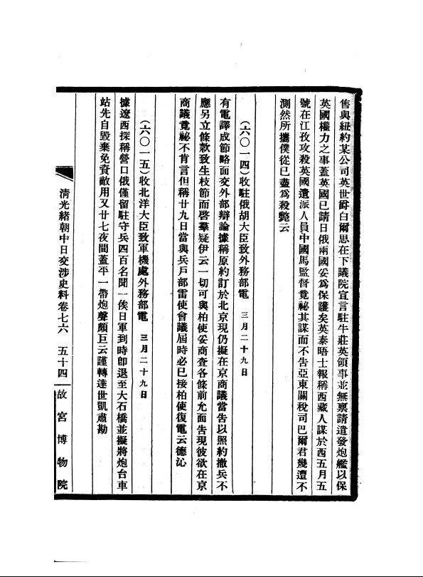 八十八卷。1932年刊行。选辑清军机处档案,卷一至卷七十四为1875—1908年(光绪元年至三十四年)间一般中日交涉的奏者、廷寄、电奏、电寄等,卷七十五至卷八十八为1903—1905年(光绪二十九年至三十一年)间日俄战争时的《东事收电档》,为研究清光绪朝中日关系的重要史料。