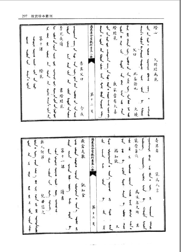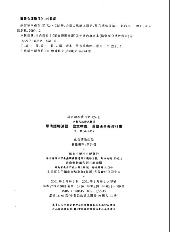 少数民族语文图书(四部之后共三十种图书,见总目录,本丛刊编印成十三册)。本丛刊选收了满蒙汉字书和满汉对照及纯满文图书共三十种。满文现在虽已是无人使用的文字,但他总还是需要有人学习和研究的,本类书将给他们提供一份最原始准确的资料;此外,本丛刊推出部分满文图书,也是为了反映故宫藏书的一个特点。