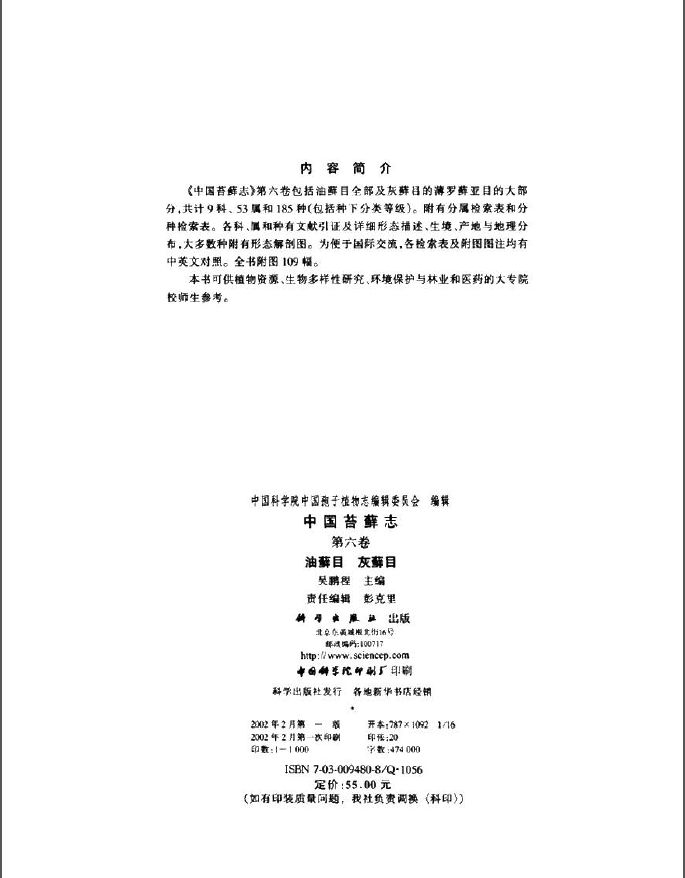 006中国苔藓志 第六卷 油藓目 灰藓目 吴鹏程主编 科学出版社 2002.pdf 237.23 MB