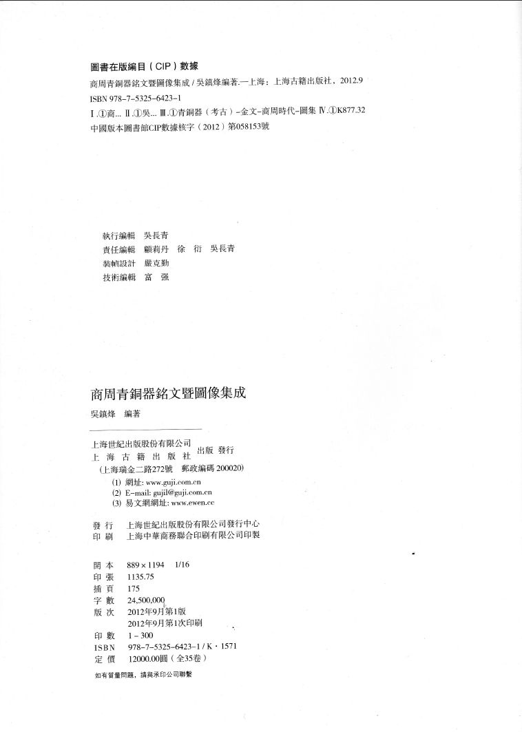 【内容提要】 本书共收录传世和新出土的商周有铭青铜器16704件(下限到2012年2月),包括食器(鼎、鬲、甗、簋、盨、豆等),酒器(爵、角、觚、觯、杯、尊、卣等),水器(盘、匜、鑑等),乐器(钟、鎛、铙、铃等),兵器(戈、戟、矛、殳、剑等),用器(农具、工具、符节等)及其他(金银器等)。该书既收录青铜器铭文拓本,又收录图像,同时将释文和相关背景资料编排在一起,给古文字研究者以及考古、历史学者,提供了一份较为完整的资料