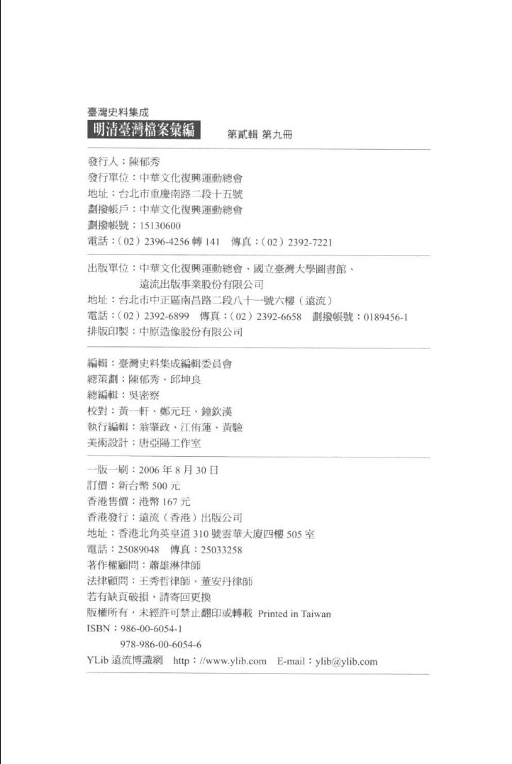009明清台湾档案汇编 第2辑 第9册 清康熙二十三年至清雍正二年二月 台湾史料集成编辑委员会编 中华文化复兴运动总会;国立台湾大学图书馆;远流出版事业股份有限公司 2006_.pdf 88.75 MB