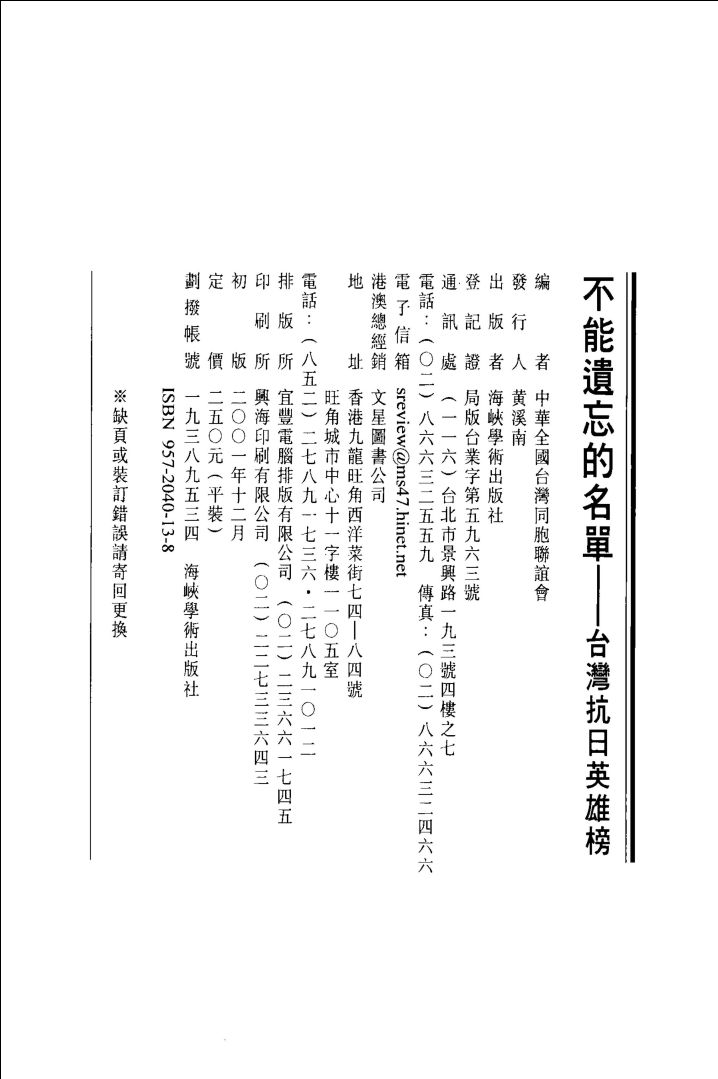 001不能遗忘的名单 台湾抗日英雄榜 中华全国台湾同胞联谊会编 海峡学术出版社 2001.pdf 183.91 MB
