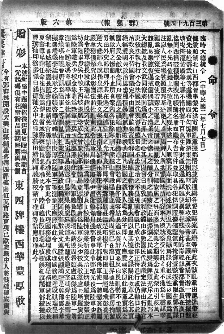 《群强报》的版式很特别,四开长条一大张,八个版,刊登“紧要新闻”、“本京新闻”、“社会琐闻”等,针对的是京城小市民,这一群体爱听京戏,识字不多,认识几百个字,就能勉强对付看报了。“一元钱能换多少铜子票、煤、煤球”,“米、面、杂粮的市价”之类的民生新闻,应有尽有。广告以京戏最为齐全,不仅有当天各戏院的戏目,两三天的预告,而且什么演员唱什么戏,开列得十分详细。报纸开列的栏目和广告,全是小市民看得懂而又喜闻乐见的事情。史料有载,《群强报》发行量最高时达五六万份之多。