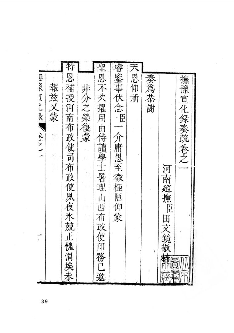 《抚豫总制宣化录》五册 ,版别:缩微中心 2005年6月出版田文镜(1662—1733),字抑光,清汉军正黄旗人。相传曾为雍亲王(即世宗)藩邸庄头。康熙二十二年(1683),由监生任福建长乐县丞,累迁至内阁侍读学士。雍正元年(1723),署山西布政使。二年(1724),调任河南布政使,署理河南巡抚之职,此后八年均在河南供职,直至去世。其执法严厉,平息盗贼,改革河工,以严厉刻深为治。田本人既未中举,也未考取进士。在河南推行“摊丁入亩”,政绩卓著,很得世宗皇帝的宠眷。尽管多人对他心存不满和恨意,但始终未被罢免。1727年8月,世宗称赞田的政绩,申斥弹劾田的人为欺君,擢田为河南总督—一个专为田特设的官职。1728年田文镜被授予河东总督,节制河南、山东二省,并加兵部尚书衔。在任推行苛政,搜求盘剥,匿灾不报,致百姓流离失所。后以老病辞官。