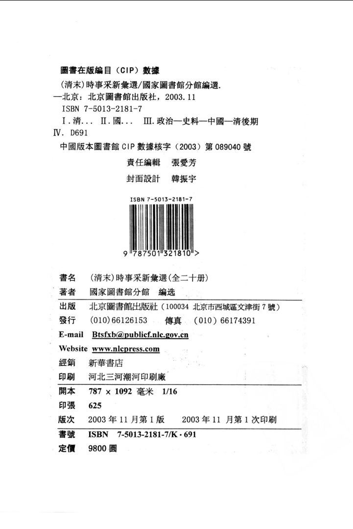 《(清末)时事采新汇选》 全二十册, 北京图书馆出版社 2003年11月出版 ,本书为存世较早、收报最多的综合性清末报刊文摘集。原书活字本,线装,七十函。每函六册,每册一卷,凡四百二十册,四百二十卷。收录清光绪28年(1902)正月——清光绪33年(1907)八月,清光绪朝廷的政事动态、谕旨、奏折和四十余家中外报刊发表的新闻、政论等近七千篇文章,既是社会上传播朝廷政事信息的载体,又尽集群报,撷采精英,内容极其丰富。本书编制有序,体例整齐,虽为泱泱四百二十册,但体例完全一致:每函首册,按日列目,标明本函所载文摘细目,每册之内依年逐月按日编发各报刊所载当日、近日要事,每日编发文摘均分别注明原发报刊名称。每日编发要事内容大致有五:一、当日光绪皇帝的诏书命令,皇帝、皇太后及皇族的起居言行,官吏的任免赏罚,大臣的奏章文报,六部的军政信息等。二、近日主要报刊发布的国际、国内、社会新闻及报道。如:“德营胶州近况”、“日俄在仁川交战详情”、“纪英兵入藏事”、“纪第一次付赔款”、“外务部会同全权大臣向英使催还关内外铁路”、“纪华商娶白种女致巨富”、“恤孤善举”等。新闻内容关乎国内外政治、经济、军事活动。各国动态、中外交涉、文化情报、风俗变迁、商贾贸易、时人行踪、教育信息、市井轶事等,凡可惊可愕可喜之事,足以“新人听闻”者,靡不毕载。 三、近日主要报刊发表之政论。如:“论英国在地中海实力”、“论俄法联盟”、“论英日联盟”、“论德国争揽长江利权”、“论中国路矿将尽归外人”、“论俄人窥伺西藏详记”、“论国家兴亡”、“论各国待中国之狡”、“论主权”等。政论内容多评国际时局,论清廷现状,数社会积弊,阐明“强邻环视,伺隙而动”的严峻局势,揭露俄、日、英、法等国索岛岸、揽铁路、涎矿产的罪行,痛陈中华民族面临的落后挨打、亡国灭种的危险,为中国富强提出造兵舰,制枪炮,练兵将,固边防,建铁路,开厂矿,举真才,通贸易,识洋务,严法纪等一系列措施。四、近日报刊转载之重要公牍、章程、文告。如:“盛宣怀致上海关道书”、“江督刘坤一与外务部与全权大臣往来电文”、“直隶厘金新章”、“豫抚锡良布告通省各属筹议赔款公启”、“闽中商务章程”、“中葡广滇铁路合同”等。 五、介绍各国历史地理、人文科学的短文、商业行情及通俗时事小品。如:“各国变法功效考”、“列强贸易输出输入额表”、“脱兰斯法尔之产金额”、“袁军侦探歌”、“湘乡女史劝女学歌”等。 每日要事之中,新闻和政论篇幅最多,体现着近代报刊重视新闻、重视言论的基本特色。 《时事采新汇选》的一大特色是没有门户和藩篱之见,教会报、维新派报、官报、民办报、外报,各派各家、各种议论统统纳入,既有着丰富的信息量,又可以让现在的读者了解各报办报特色,对当时的局势有一个整体的把握。《时事采新汇选》采用的著名报刊有《万国公报》、《大公报》、《时报》、《申报》、《苏报》、《北洋官报》、《北洋学报》、《北洋商报》、《北洋法政学报》、《南洋官报》、《日日新闻》、《外交报》、《中外日报》、《汇报》、《新闻报》、《北方日报》、《济南报》、《津报》、《晋报》、《汉口日报》、《顺天时报》、《蒙学报》、《商报》、《商务报》、《商务官报》、《漳泉日报》、《同文沪报》、《政艺通报》等三十余家中国报纸和日本《国民新闻》、《外交时报》、《东邦协会报》、《太阳报》,英国《泰晤士报》、《斯忒梯司报》、《诺挺威报》、《翻连苏报》、《显屈烈报》等十几家日、美、英外国报纸,可谓群报毕集。 广博的新闻覆盖面和多种形式的新闻文体构成本书的另一特色。在《时事采新汇选》中,政治新闻占据了首要地位,此外还有国际新闻、经济新闻、商业新闻、奇闻轶事和市井新闻,凡国家之政治、风俗之变迁、中外交涉之要务、商贾贸易之利弊均有报道,足以为读者通信息、广见闻,且新闻多、消息快,报道面涵盖很广。新闻文体方面,既有三言两语简明扼要的短讯,也有字数较多、夹叙夹议的长篇;既有对一个事件进行的专门报道,也有对同一类事件进行介绍和分析的综合报道。 本书的第三个特色是重视政论。《时事采新汇选》一书政论每日必有,比例占到三分之二,上关皇朝经济之需,下系小民稼穑之苦。各报的报人针对新近发生的国政大事、洋务外交,以短小精悍的形式作一事一议的针砭,评论举措,褒贬得失,抨击时弊,介绍新学,揭发基层苛政,为中国富强献策。其论据充足,其逻辑严密,操斧伐柯,尖刻辛辣,富有鼓动性和感染力。 清光绪末年,屡经兵事,时局动荡,史所罕见的四万万五千万巨额赔款,压在中国人民头上,帝国主义列强对中国虎视眈眈,软弱的清朝廷,财务被人监督,税收被人把持,交通、铁路、采矿被洋人控制,士人生活与官兵薪饷每况愈下,晚期的清帝国面临多事之秋。经历了甲午海战的失败(1895)、戊戌变法的流产(1898)、庚子事变的耻辱(1900),国人有了迫在眉睫的危机。《时事采新汇选》收民心,收公议,喊出了当时各阶层的呼声。此书所载,再现了清光绪末年每月每日的朝野要闻、中外之事,穹苍之大,若在指掌,具有极其珍贵的价值。对于了解晚清社会风尚、文化思潮及晚清报刊,对于触摸晚清,