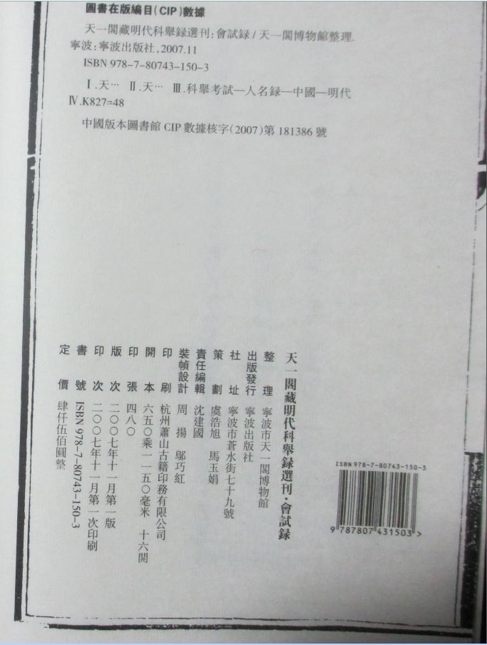 丛书名称:天一阁藏明代科举录选刊