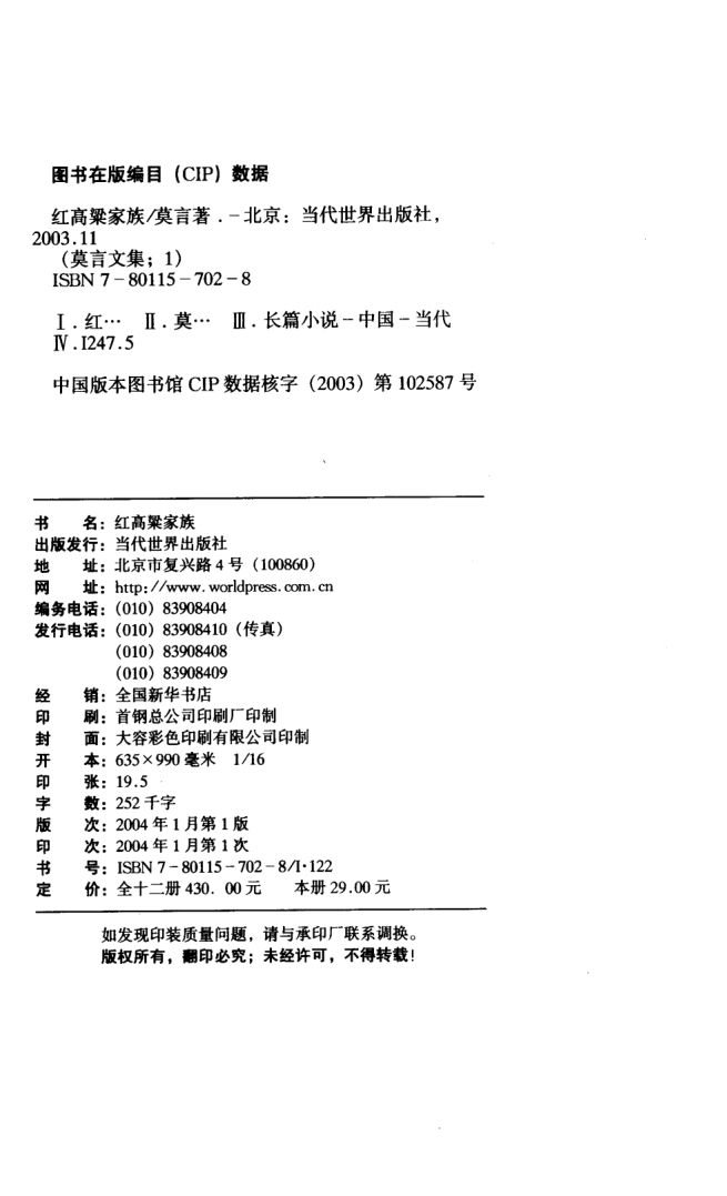 莫言文集 第01册.红高粱家族.莫言著.当代世界出版社.2004年1版1刷.pdf 16.98 MB