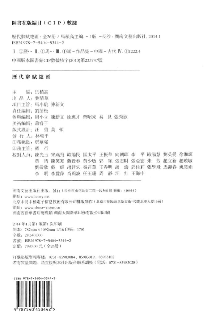 书籍提要:收集先秦到清代末年的辞赋作品,总字数2854万字。《历代辞赋总汇》曾列入国务院古籍整理出版规划小组《中国古籍整理出版十年规划和“八五”计划》的重点项目,也是国家新闻出版总署《关于“八五”图书选题出版计划》的重点图书选题。全书分为8卷,一共26册:先秦汉魏晋南北朝卷1册,唐代卷2册,宋代卷1册,金元卷1册,明代卷4册,清代卷14册,详目卷1册,索引卷2册。索引有人名与篇名、拼音与笔画两种。