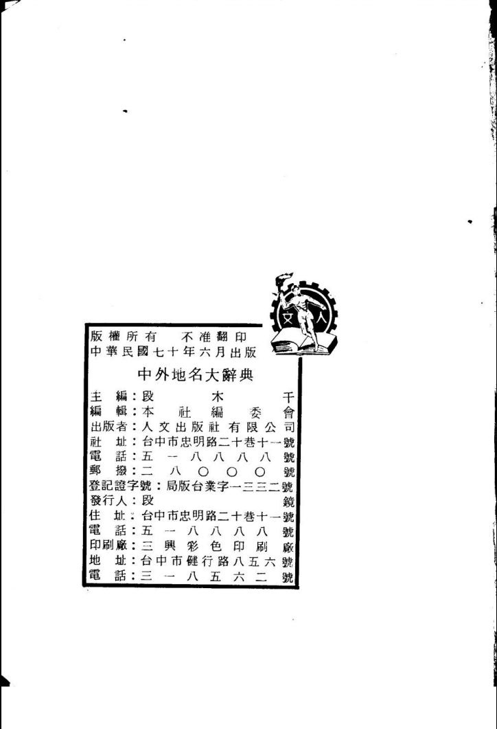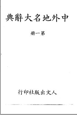 段木干主编,人文出版社编委会编辑,台北市人文出版社有限公司1981年6月出版,台北市人文出版社组织庞大人力,筹集巨大资金,费时十年,编成此书。全书博采我国古今地图和世界各国地理年鉴,调查甄录,辨其沿革,审慎刊正。共 9 000余页,900余万字,精装成九大分册。所收地名按中文首字笔划顺序排列,外国地名也按中文音译名的字顺排列其中,而后再给出英文名称。所辑地名,均著出其地理位置、地形、地貌、人口、物产、气候、历史变化等。最后两册为中文索引和英文索引,附录包括:世界主要河流;世界主要运河;世界主要湖泊;世界主要山峰;世界主要岛屿;世界主要沙漠;世界列国一览。目前在我国(包括大陆和台湾),这本书是编纂比较详尽的地名辞典,因此它的参考价值较高,适宜地理学研究人员和广大读者使用。