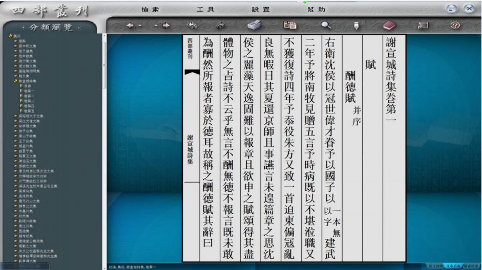 《四部丛刊》电子版保有纸张版本的全部内容,并使每个汉字数码化,从而实现字字可查、句句可检的快速全文检索,并且提供了摘要、笔记、纪元换算以及简、繁、异体汉字相互关联查询的功能。