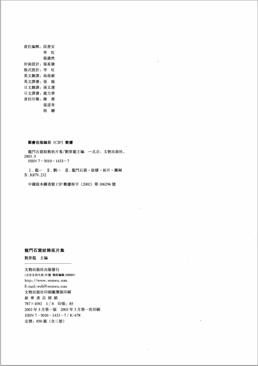 《龙门石窟纹饰拓片集(共3册)》主要内容:前言对龙门石窟的介绍与研究,自19世纪至今,国内外出版有较高水平的专著计30余部、论文400余篇,通俗读物也在10种以上。但系统地、整体地展现龙门石窟艺术的出版物十分缺乏,目前为止还没有出版过一套龙门石窟完整的数据。然而,宇宙间的万物生生灭灭,损毁乃至最后消失是不可避免的。当今工业、交通迅猛发展,环境污染加剧,造成龙门石窟风化、洞窟漏水、洞窟及雕刻品崩塌,各种病害日见明显。80年代初拓印过的造像题记,现今有些已经看不到。一些精美的造像题记,现今有些已经看不到。一些精美的造像也渐渐面目不清。为了使龙门石窟艺术保留下去,让世人可以长久地进行研究,并从中欣赏其艺术之美,在利用现代技术保护、维修以延长石窟寿命的同时,我们采取各种方式收集、保存龙门石窟的数据,加以整理,予以出版。继出版《龙门石窟总录》用文字著录、辅以黑白照片和测绘图保存龙门石窟的基本资料后,又按照崖面编号顺序,逐一拍摄窟龛造像,出版了《龙门石窟造像全集》,保存造像艺术的完整数据,与此同时,再把精美的浮雕艺术、图案纹饰逐一挺、捶拓出版,《龙门石窟纹饰拓片集》就是为让读者能通过另一种形式欣赏龙门石窟艺术。多种形式结合起来,即使读者全面了解龙门石窟艺术,又在现有条件下把龙门石窟的数据系统完整地保存下来,傅诸之远。在科学技术还未能解决石窟文物永久保护的情况下,这应当是保护龙门石窟的一种行之有效的方法吧。 石窟寺开凿在山崖上,供教徒作佛事活动之用。中国的石窟寺多分布在黄河流域和西北地区长江以南和西藏也有一些开凿。因开凿时代、地域、施主而异,各石窟的雕刻内容与艺术面貌有所不同,石窟所在地的岩石质地和气候不同,完好程度也不相同。敦煌莫高窟、麦积山石窟所处岩体为粗砂砾岩,不能就山雕刻,所以在洞窟中泥塑造像,并抹平壁面绘制壁画。新疆地区的克孜尔、库木吐喇、柏孜克里克等石窟,岩体为砂砾岩,与敦煌莫高窟大体相同,由于气候干燥,洞窟中壁画保存尚好。云冈、大足等石窟均雕凿在细砂岩石上,岩石吸水率高,一些精细雕刻品风化严重,保存下来的已不多。龙门石窟和响堂山石窟所在岩体为石灰岩,结构细密,保存尚好。近30年来,大气污染明显加剧,龙门石窟所在的岩体及雕刻品表面风化也渐趋严重,变化人眼可见,只是相对其他石窟,损坏坏慢而已。所幸北魏到唐代精美细腻的雕像和装饰图案保存下来的还不在少数,是美术史研究,包括佛教美术、建筑、装饰、书法、服饰和政治、经济、文化、历史、宗教等诸多方面研究的珍贵史料。