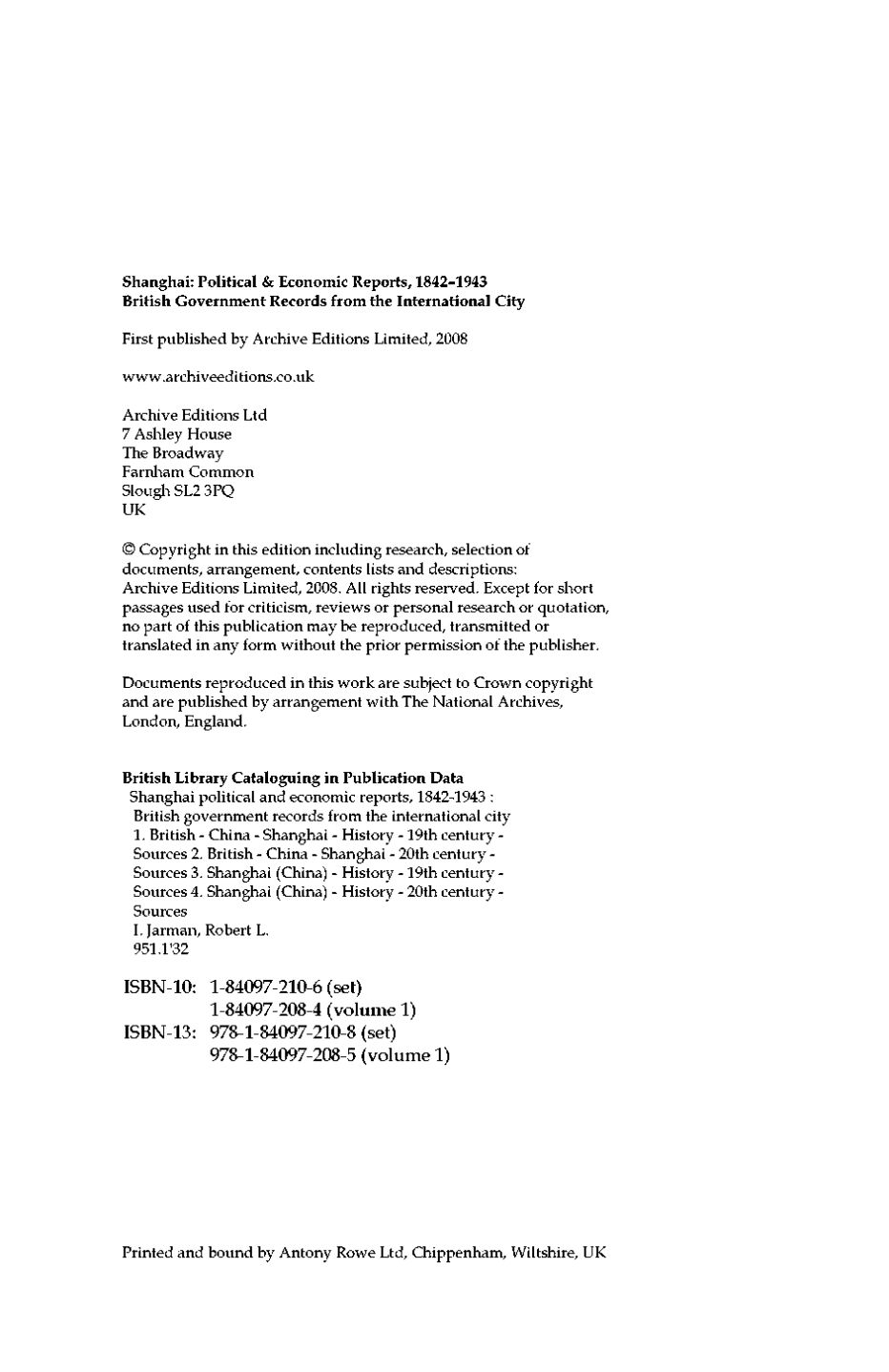 The remarkable and durable institution of the International Settlement allowed the British to report in detail on political and economic matters in Shanghai and China. This collection of primary documents, establishes a comprehensive series of despatches, in the main from the British consul in Shanghai to the British ambassador to China based usually in Peking, but in the 1930s based in Shanghai itself. The form and extent of communications vary during the period, and include annual reports and trade returns, judicial reviews, despatches on topics of interest and telegrams on urgent matters. After 1920 series of quarterly political reports and six-monthly intelligence summaries are initiated, and some other irregular periodic reports emerge. There is regular information on the government of the Settlement, and reports on the opium trade; there are extended reports, in 1856, on the continuing Taiping Rebellion, and later, reports on the Sino-Japanese war over the control of Korea; from 1901-11 reports include: the Boxer Rebellion; commentary on the French settlement; anti-government conspirators in Shanghai; the Russo-Japanese war; the Shanghai tramway system; the bubonic plague in Shanghai; the Chinese revolution of 1911-12; British intelligence reports on German activities, 1914-18; and in the mid-1920s telegrams reflect the impact of the civil war in China, and report “the Shanghai incident”. The collection of documents ends with the winding up of the Settlement under wartime Japanese occupation, and numerous papers in 1942 carry discussion of this conclusion.