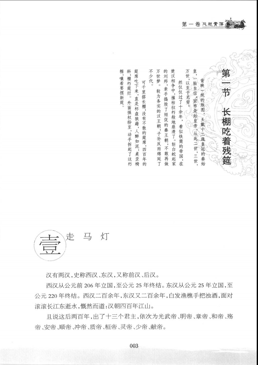 第一卷:《风起青萍》讲述了大汉雄风劲飚四百年,到头成强弩之末。君主昏聩,宦官专权,外戚裙舞,肩负道义的士人奋起抗争,酿就千古奇冤的党锢之祸。官场腐败,边境不宁,天灾连着人祸,民不聊生,激出黄巾黄旗黄海洋。残阳泣血,风起云涌,卷起一场天崩地坼的大变局。乱世造英雄,袁绍、曹操、刘备、孙坚等豪杰,摩拳擦掌,从地平线上纷纷冒出身影。
