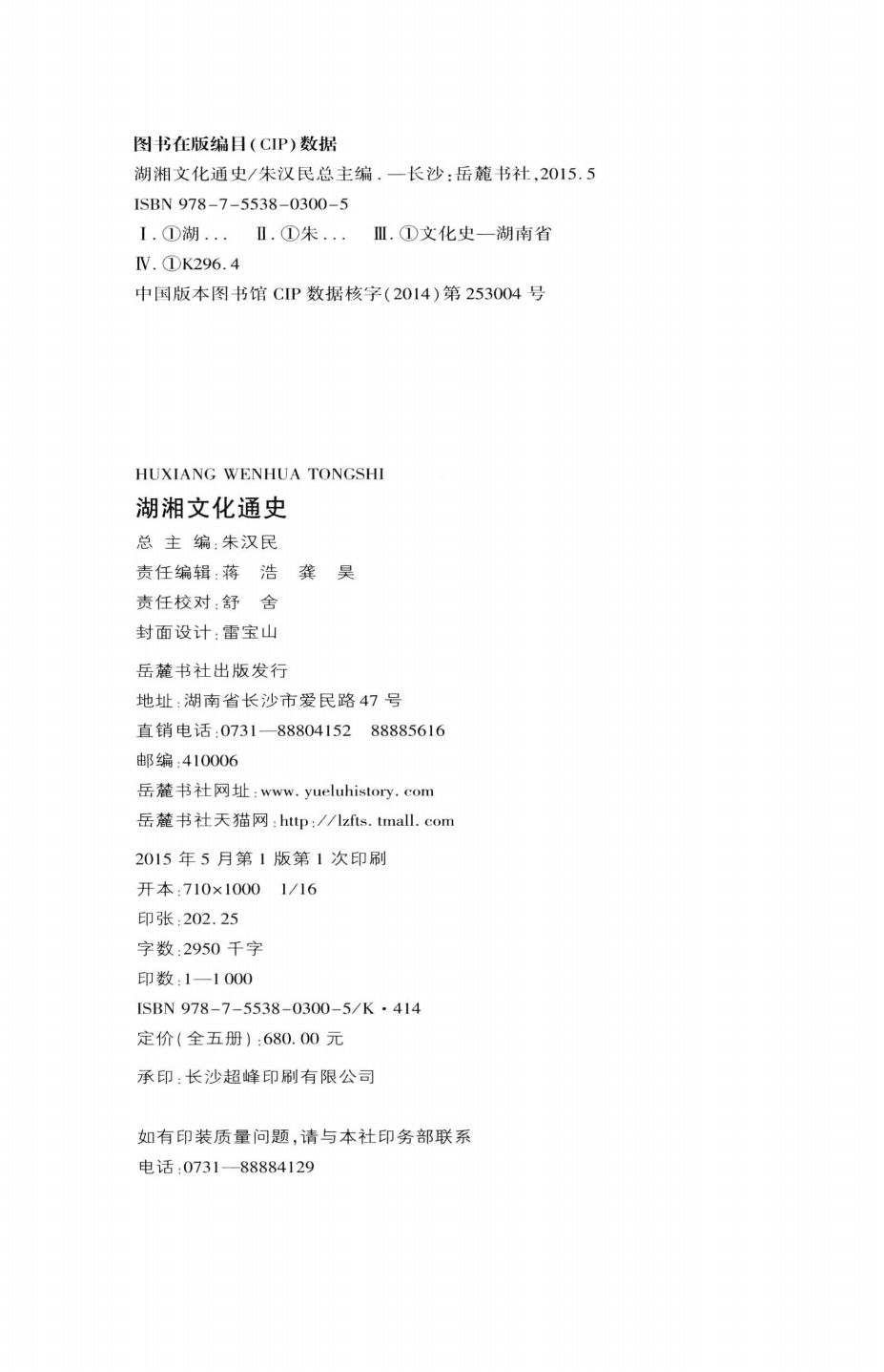 《湖湘文化通史》由《上古卷》《中古卷》《近古卷》《近代卷(上)》《近代卷(下)》五卷组成,由谭仲池先生担任编委会主任,岳麓书院朱汉民院长担纲总主编,向桃初、王勇、万里、陈松长、肖永明、王兴国、吴仰湘、陈先初等知名专家学者为分卷主编。全书共计295万字,是迄今为止对湖湘文化从萌芽、形成到发展、壮大的过程最全面也是最权威的分析总结和评述。它的面世不仅可以填补当前湖湘文化研究的空白,更将以它独立的学术思维和史学逻辑影响未来学者对中华地域文化的研究探索。同时,本书也是岳麓书社多年致力于出版湖湘典籍、湖湘文化研究著作的重要延续。