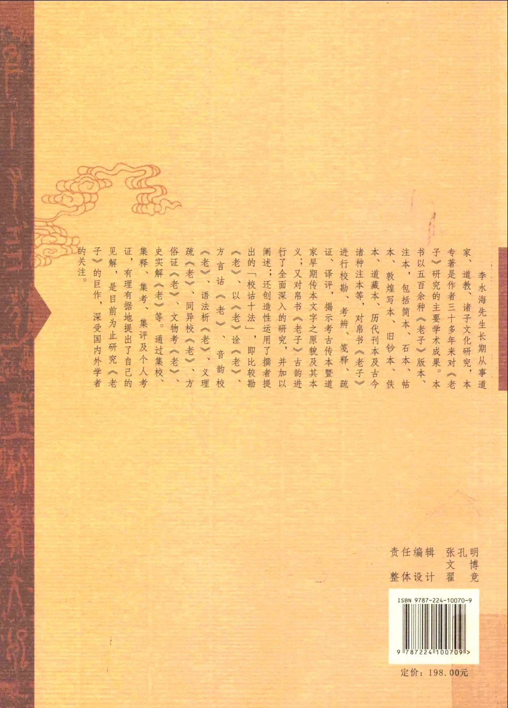 《帛书老子校笺译评(上、下)》,本书是一部研究《老子》的专业化学术作品,作者以500余种《老子》版本、注本为参考,对帛书《老子》进行校勘、考辨、笺释、疏证、译评,揭示考古传本及道家早期传本文字之原貌及其本义,又对帛书《老子》古韵进行了全面深入的研究,并加以阐述,有理有据地提出了自己的见解,是目前研究《老子》的一部不可多得的巨著。