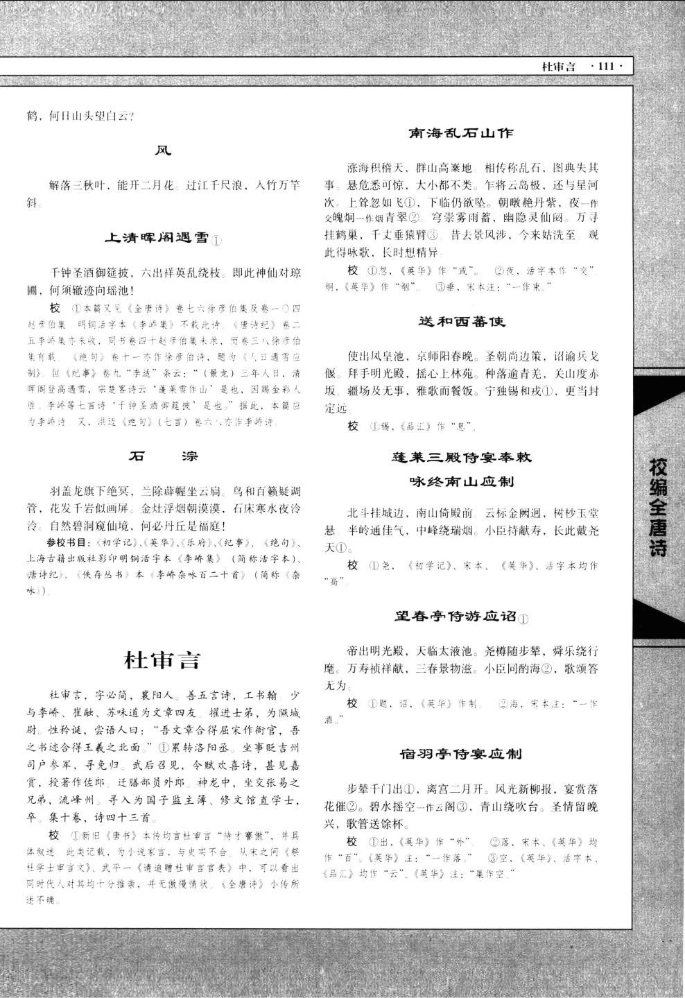 原书无考类、补遗类诗人及其诗篇,力求考订世次,标明重出以资参考;但诗人顺序一仍其旧,不予重新编排。