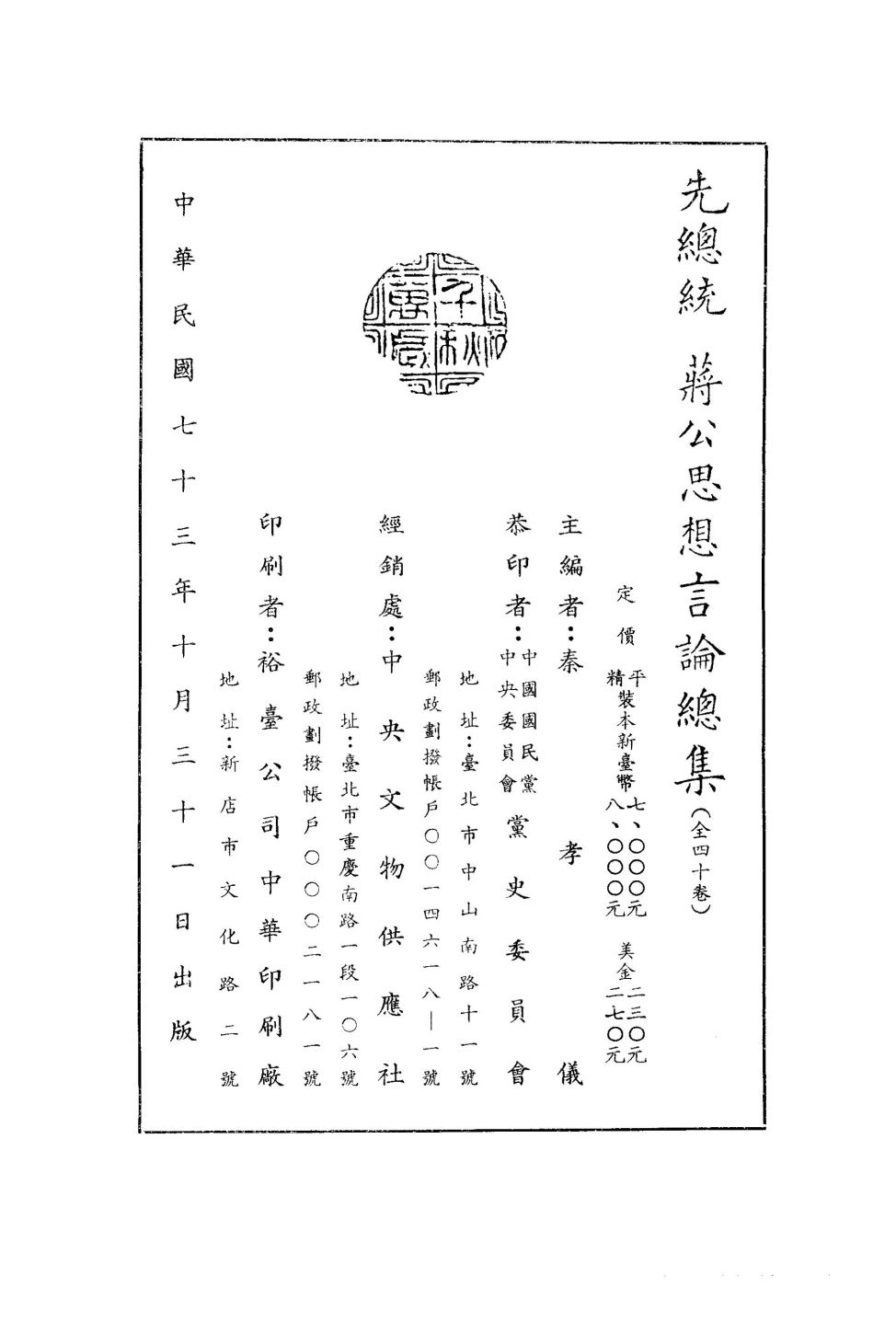 民国五十五年,孝仪曾辑印「将总统思想言论集」,祝公八十纯嘏,距今已十八年,而公之升遐,亦近十年矣。羹墙如见,謦欬莫闻,每展遗编,怆然涕下!因复裒辑五十五年十月至六十四年四月之遗稿,及前此未曾公布之文件,分为专著、演讲、书告、文录、别录、谈话、书面致词等类,并系以总目录、大事年表及论著年表三种,都四十卷,计壹仟五百余万言,敬题曰「先总统蒋公思想言论总集」,并先送请夙以文学侍从先总统蒋公之萧自诚、曹圣芬、唐振楚、楚崧秋、周应龙诸先生分别校阅,俾臻完备。